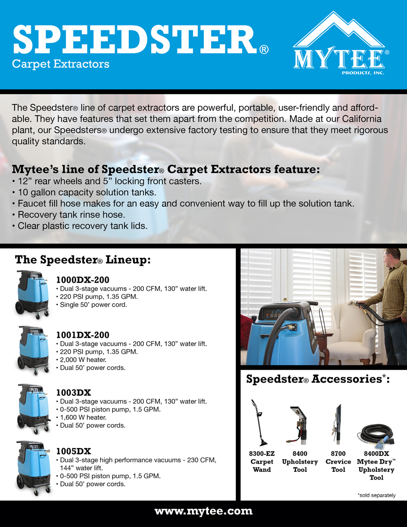 The 1005LX Speedster® carpet extractor was designed with cleaning professionals in mind. Each Speedster® has waist-high switches and bucket-high drains. The Speedsters® have 10″ foam-filled wheels and 4″ locking casters for easy mobility around the job site or even stairs. The 1005LX features Mytee’s new and exclusive Amatek Hybrid high performance vacuum motor. The 1005LX is the perfect choice for professional carpet cleaners who want maximum power, mobility, and durability. What makes Mytee’s hybrid motor better? The high efficiency is due to the unique winding of the motor and special fan configuration. When you remove more water out of the carpet, you get faster drying times. You’re also removing more dirt for a noticeably better clean. Mytee’s® revolutionary new hybrid motor delivers a water lift increase of almost 30% at the carpet compared to other vacuum motors! This hybrid vacuum motor is available exclusively from Mytee®. Mytee’s Speedster® line of carpet extractors are powerful, portable, user-friendly and affordable. Made at our California plant, our Speedsters® undergo extensive factory testing to ensure that they meet rigorous quality standards. Mytee® extractors are also covered by the strongest warranty in the industry so you can clean with peace of mind. |